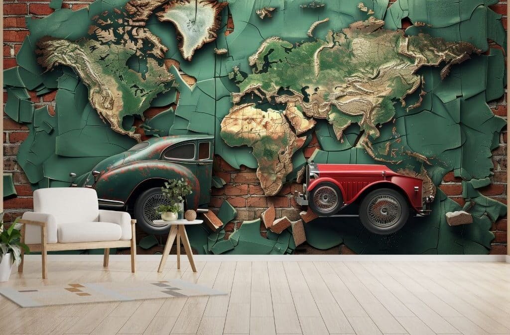3D Car Passing Through World Map on A Brick Wall Mural Wallpaper