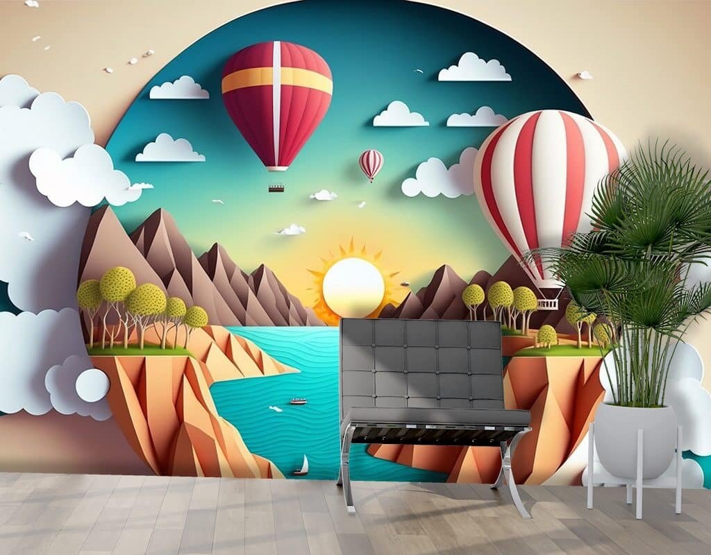 Create a dreamy and imaginative environment in your child’s room with our 3D Effect Paper Cut Out Landscape Wallpaper. Featuring vibrant hot air balloons floating over a whimsical landscape, this delightful design sparks creativity and joy for children of all ages.