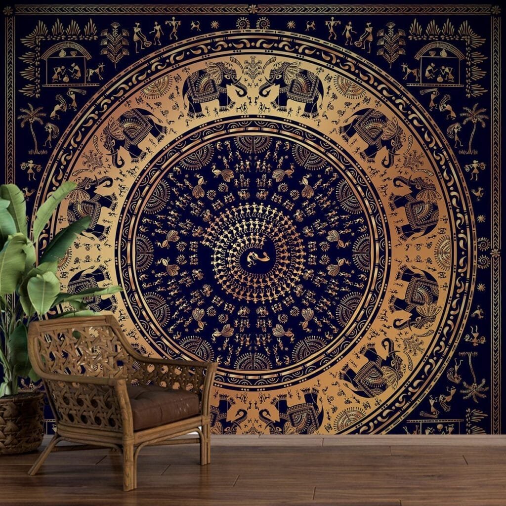 Blue and Gold Warli Art on Rug, Warli Wall Mural munder design