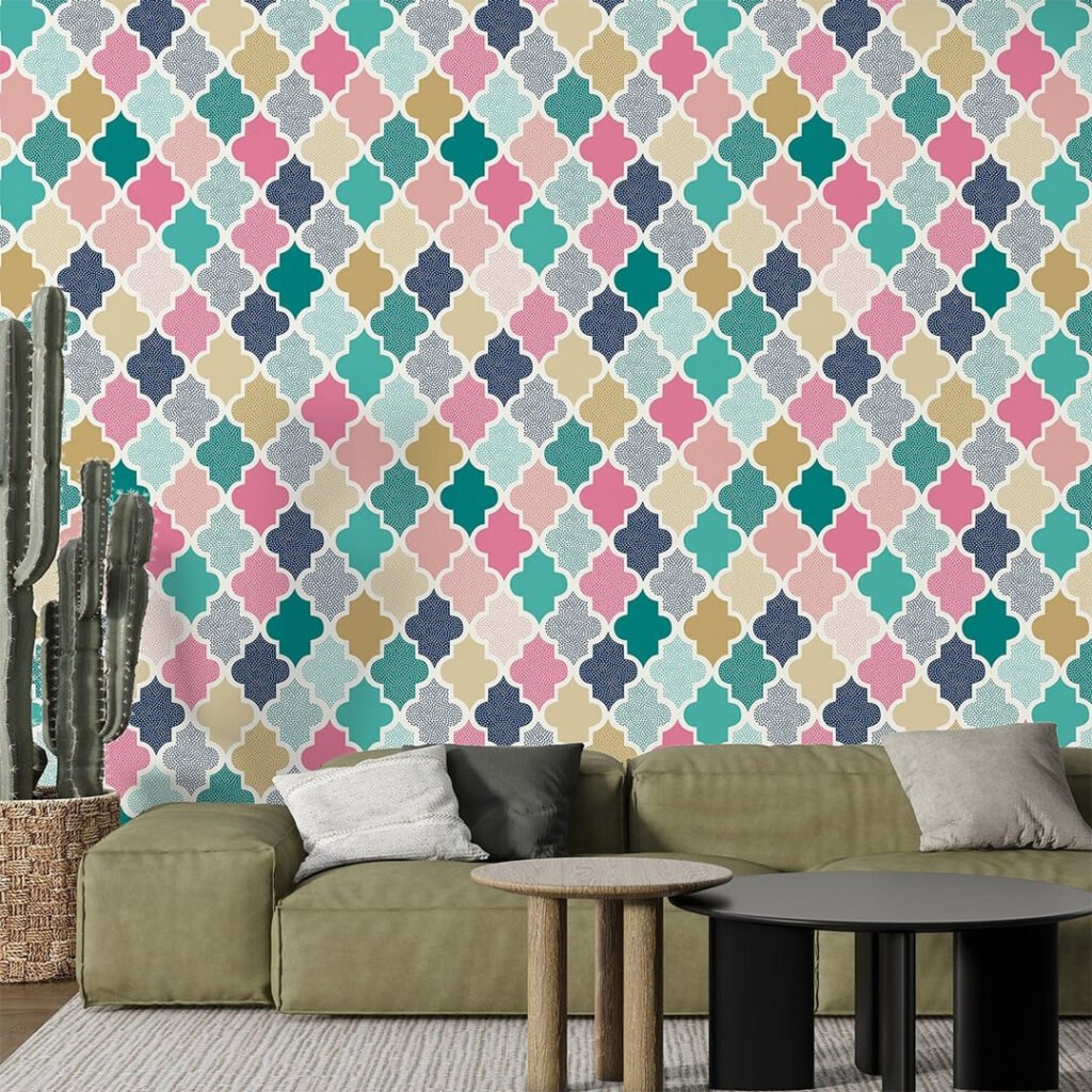 This modern Moroccan wallpaper is suited for a variety of settings including living rooms, bedrooms, offices, or even as an accent for your workspace. Available in a subtle and balanced color scheme, it complements both minimalistic and bold interior designs. Plus, it’s eco-friendly, ensuring you make a stylish choice that’s sustainable too.