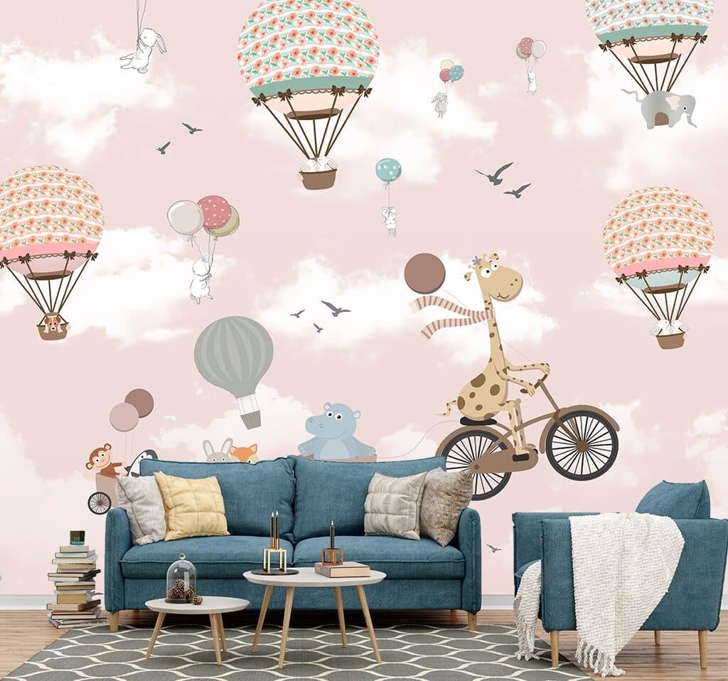 Kids Room 3D Wallpaper, A cartoon giraffe riding a bicycle with balloons and a train