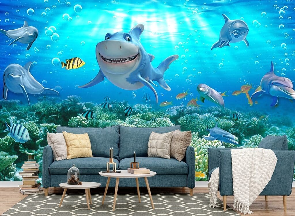 Inspire your child’s imagination with our vibrant Kids Room Wallpaper featuring a shark swimming in the ocean. This playful design instantly transforms any room into a serene underwater paradise.