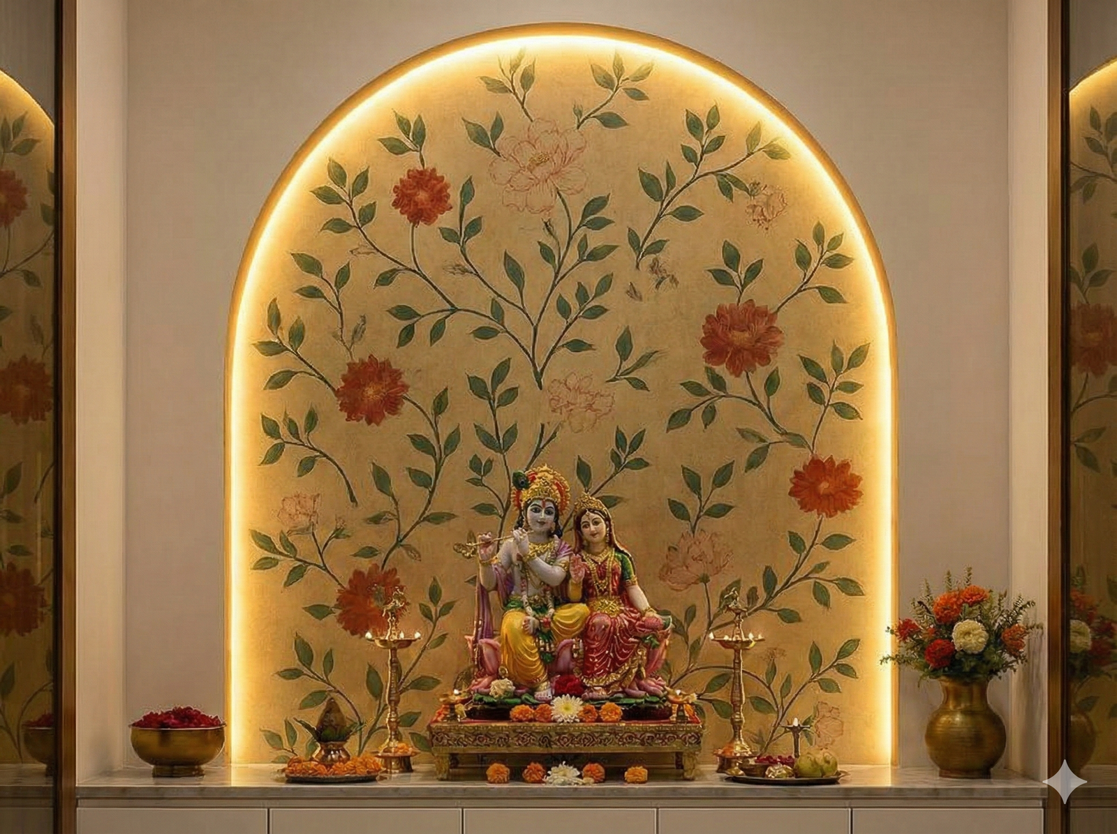 Premium 3D Pooja Room Wallpaper - Golden Arch & Floral Mandir Design with Divine Idols Theme