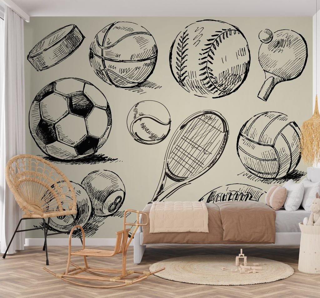 Sports Equipments Sketch Art Wallpaper Mural - Yas unique wallpaper wallpaperuniqueyas.com